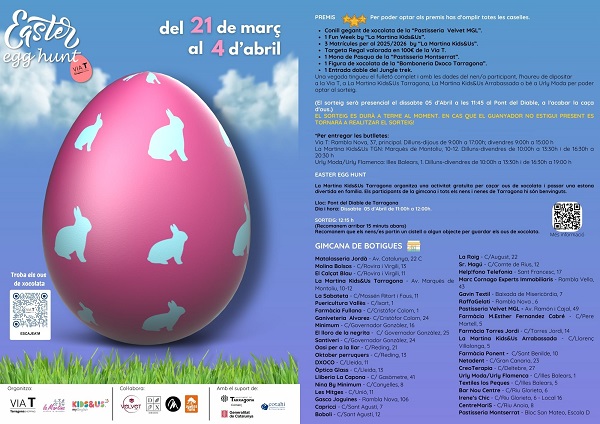 Del 21 de març al 4 d’abril, la ciutat de Tarragona acollirà la 4a edició de l’Easter Egg Hunt, una divertida i emocionant campanya que convida grans i petits a gaudir d’una experiència única i inoblidable. Organitzada per La Via T i La Martina Kids and Us, amb el suport de la Conselleria de Comerç de Tarragona, aquesta activitat té com a objectiu fomentar la diversió, l’esperit de comunitat i el comerç local, tot creant una oportunitat ideal per passar temps en família i gaudir de la ciutat mentre es descobreixen els racons més interessants de Tarragona.